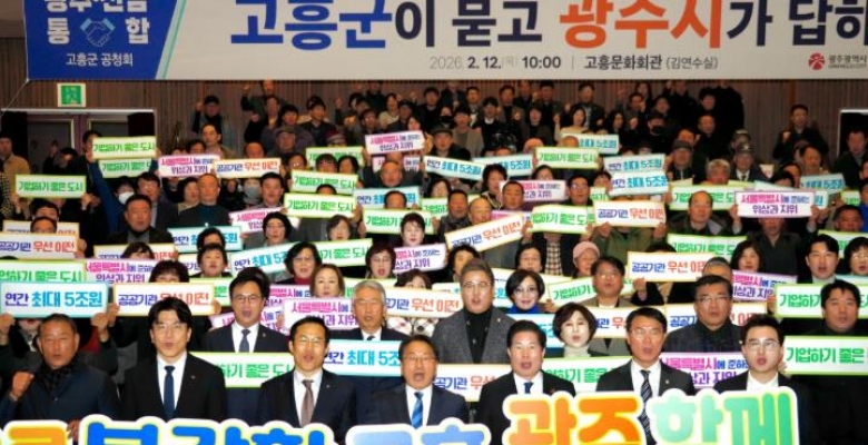 [AI 호남뉴스]광주광역시는 12일 전남 고흥문화회관에서 ‘광주전남 행정통합 고흥군 상생토크’를 열고, 고흥군 발전 전략과 통합 이후 변화상에 대해 고흥군민들과 소통했다. 이번 행사는 여섯번째 열린 상생토크로, 통합 이후 고흥의 우주·해양·농어촌 자원을 활용해 광주·전남 균형발전을 이루기 위해 마련했다. 이날 행사에는 강기정 광주시장을 비롯해 공영민 고흥군수, 류제동 고흥군의회 의장, 고흥군민 등 600여 명이 참석해 광주전남 통합에 대한 높은 관심을 보였다. 강기정 시장은 먼저 광주전남 통합 추진상황과 향후 일정, 통합에 대한 정부 특전(인센티브) 등을 설명...