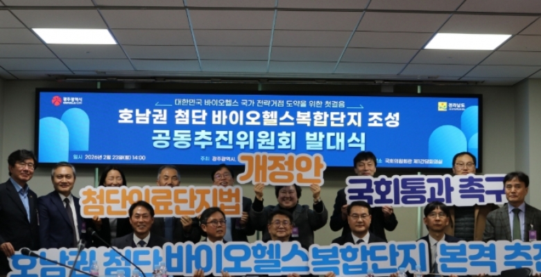 [AI 호남뉴스]광주시와 전남도가 호남권을 대한민국 바이오헬스산업의 제3전략축으로 육성하기 위한 ‘호남권 첨단 바이오헬스복합단지’ 조성에 본격 착수했다. 양 시도는 광주전남 행정통합과 연계해 산업과 기반시설의 통합 효과를 선도적으로 창출하고, 수도권 중심의 바이오헬스 산업 구조를 다극화하는 지역균형발전 모델을 구현한다는 구상이다. 광주광역시와 전라남도는 23일 오후 2시 국회의원회관 제1간담회의실에서 ‘호남권 첨단 바이오헬스복합단지 조성 공동추진위원회 발대식’을 개최하고, 입법 기반 마련과 정부 지정 전략을 본격 추진한다. 호남권 첨단 바이오헬스복합단지는 광주의...