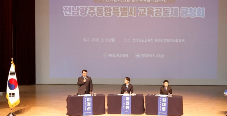 [AI 호남뉴스] 광주시교육청 ‘광주전남교육행정통합실무준비단’과 전남도교육청 ‘전남광주교육행정통합추진단’은 23일 순천만생태문화교육원에서 광주·전남 교육공동체 400여 명이 참석한 가운데 ‘전남광주통합특별시 교육공동체 공청회’를 개최했다. 이번 공청회는 광주·전남 교육행정 통합과 관련해 교육공동체의 의견을 수렴하고, 전남광주통합특별시가 나아갈 미래교육 방향을 구체화하기 위해 마련됐다. 행사는 이정선 광주시교육감과 김대중 전남도교육감이 ▲전남광주통합특별시교육청의 비전 ▲광주·전남 교육 균등 발전 ▲통합 인센티브 등 교육 재정 확보 ▲광주-전남 미래교육 모델 구축 ...