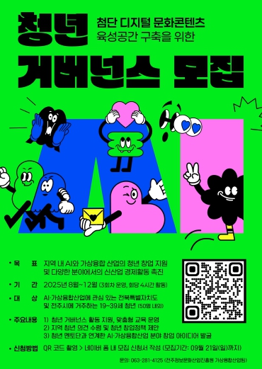 청년 거버넌스 참여단은 전북특별자치도내 거주하는 AI·가상융합산업에 관심 있는 청년(18세~39세)이면 누구나 참여할 수 있으며, 진흥원 누리집에 게시된 공고문과 첨부 양식을 확인 후 오는 21일까지 온라인 네이버폼을 통해 신청하면 된다.