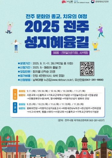 시는 9월부터 11월까지 매주 목요일 1박 2일로 총 10회에 걸쳐 전주의 역사와 종교, 문화를 체험할 수 있는 지역특화 치유순례 프로그램인 ‘2025 전주 성지혜윰길’을 진행한다고 9일 밝혔다.