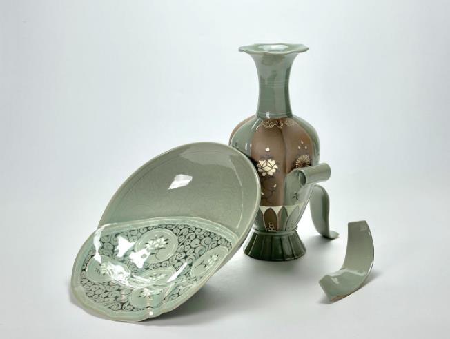 작가는 참외모양 청자 병의 껍질을 깎고, 사발 안에서 상감무늬가 흘러내리는 듯한 재미 요소를 넣은 장식 오브제로, 전통 고려청자의 아름다움에 새로운 해석을 가미하여 작품에 시선을 오래 머무를 수 있게 의도했다.