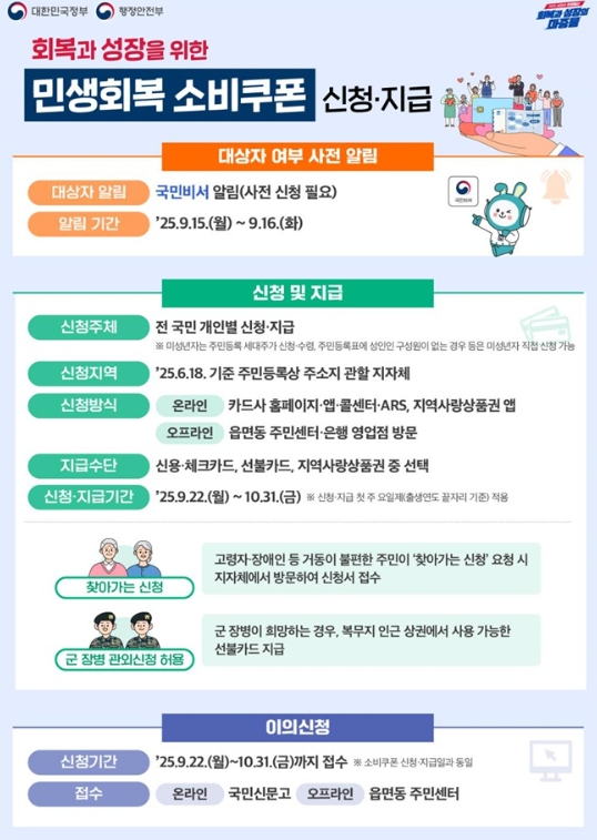 민생회복 소비쿠폰 2차 신청은 10월 31일을 끝으로 신청과 지급이 종료되므로, 소비쿠폰을 지급받고자 하는 군민은 반드시 기간 내에 신청해야 한다.