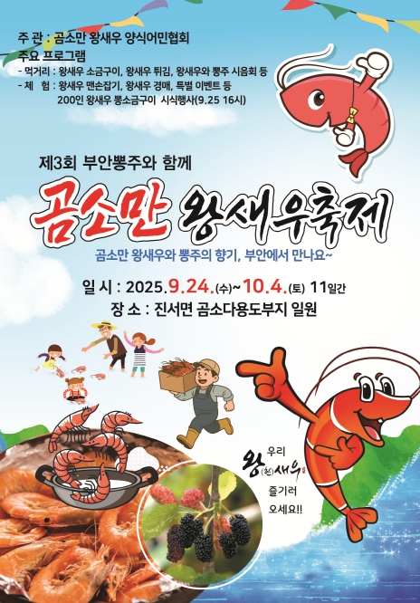 김태수 곰소만 왕새우 생산자 어민협회 대표는 곰소만 청정해역에서 정성으로 키우고 있는 양식어가들이 작은 뜻을 모아 준비했으며, 곰소만 왕새우의 통통하고 싱싱하고 영양가 높은 왕새우와 부안 뽕주의 로컬 브랜드 축제장에 많은 관광객이 방문하여 왕새우 참맛을 느끼고, 작은 소소한 추억도 담아가기 위해서 꼭 축제장을 찾아주기길 바란다고 전했다.