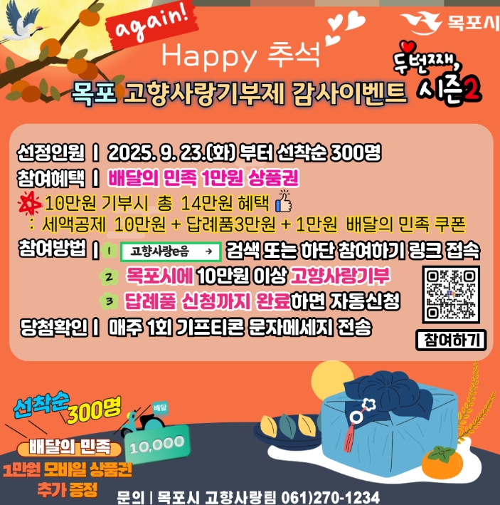 ![]() 목포시, Happy 추석~ 고향사랑기부 감사이벤트 시즌2 |