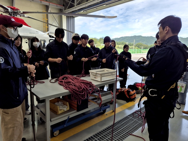 학생들은 소방헬기에 탑승해 출동 절차를 직접 경험하고, 구조와 구급업무를 동시에 수행하는 항공대원의 역할을 이해하는 시간을 가졌다.