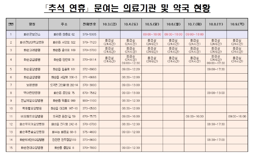 지역 응급의료센터인 화순전남대학교병원을 비롯해 병원 14개소, 의원 41개소, 보건소 1개소, 약국 23개소를 추석 연휴 동안 문 여는 의료기관 및 약국으로 지정·운영해 환자 진료 공백 방지와 군민들의 진료 및 약품 구매의 불편을 최소화할 계획이다.