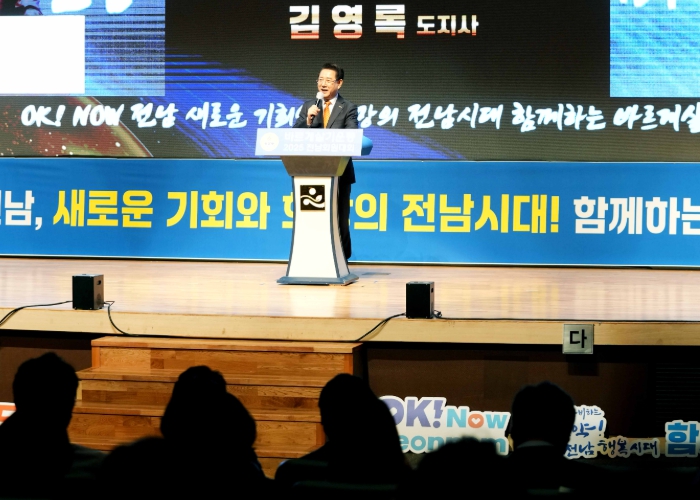 ![]() 김영록 전라남도지사가 25일 도청 김대중강당에서 열린 ‘2025 바르게살기운동 전남회원대회’에 참석해 격려사를 하고 있다. |