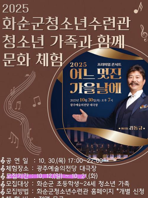 이번 공연은 10월 30일 저녁 7시 광주 예술의전당 대극장에서 열리며, 청소년과 가족이 함께 클래식의 향연을 만끽할 수 있는 뜻깊은 시간으로 감미로운 선율과 가을의 낭만이 어우러져 청소년의 문화 감수성을 일깨우고, 가족에게는 따뜻한 교감의 장을 선사할 것으로 기대된다.