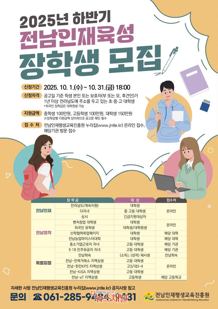 전라남도와 전남인재평생교육진흥원은 교육기회 확대와 지역 인재의 성장을 돕기 위한 ‘2025년 하반기 전남인재육성 장학생’을 오는 31일까지 모집한다고 밝혔다.