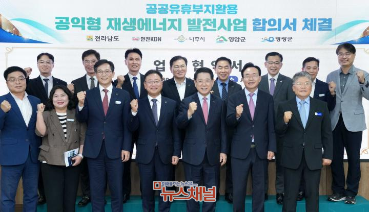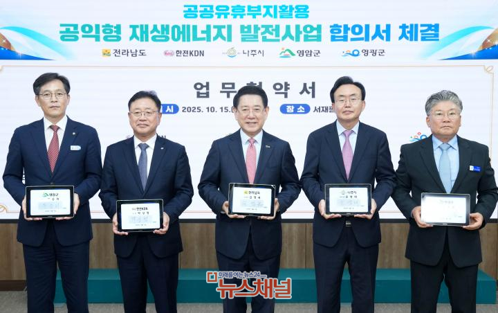 전라남도는 15일 나주시청에서 새 정부의 재생에너지 대전환 기조에 발맞춰 나주시, 영광군, 영암군, 한전KDN과 함께 ‘공익형 재생에너지 발전사업’ 업무협약을 체결했다고 밝혔다.