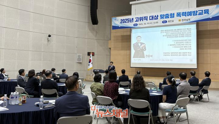 On October 15, Jeonnam Province held a customized training session on the four major types of violence—sexual harassment, prostitution, sexual violence, and domestic violence—for senior officials, including Deputy Governor Kang Wi-yeon and heads of departments, at the Wangin Room of the provincial office.