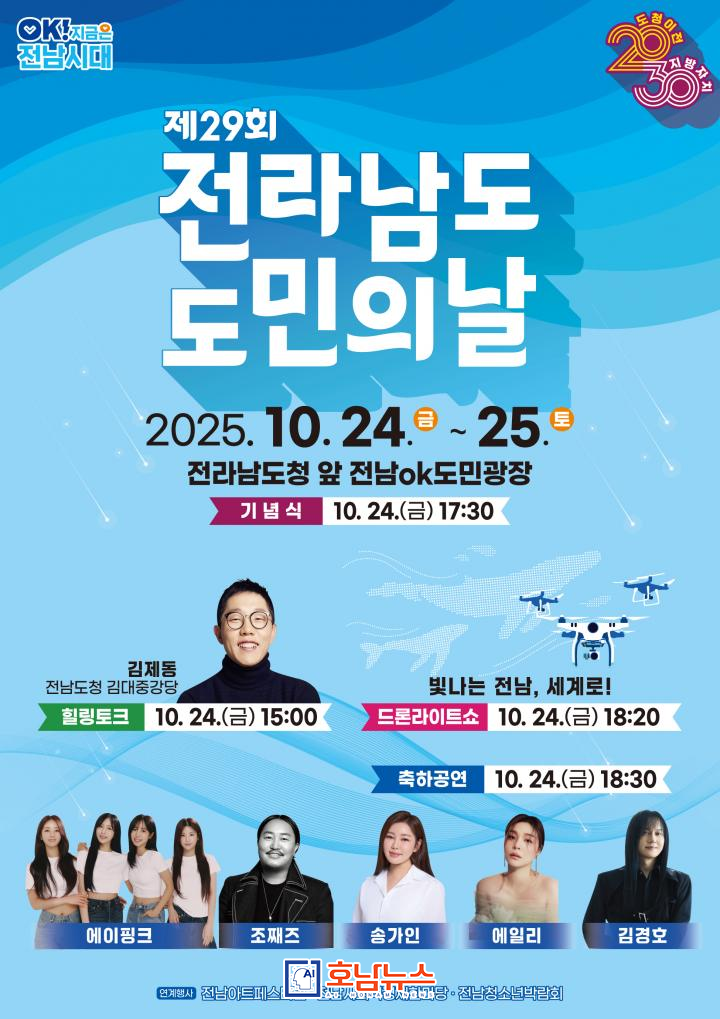 The ceremony will feature a pre-performance, reading of the Residents’ Charter, and presentation of the Proud Jeonnam Citizen Awards, followed by a thematic performance reflecting Jeonnam’s past and future, a pledge event for attracting the Artificial Sun Research Facility, and a policy vision drone light show symbolizing hope and Jeonnam’s soaring future.