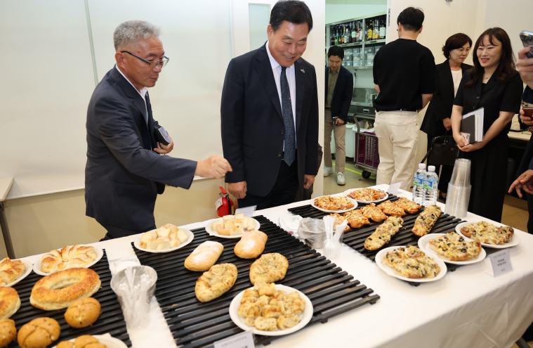 ![]() 지난 7월 무안군-신세계푸드 협약식에서 무안 양파빵 제품을 살펴보는 김산 군수 |