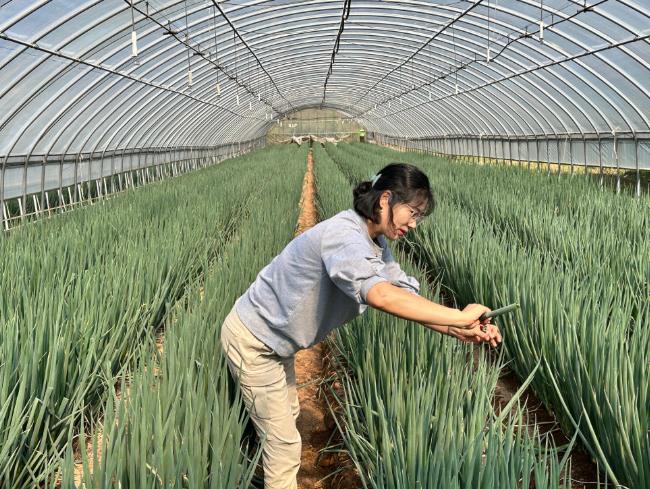 ![]() 대파 생육 상황을 살펴보고 있는 모습. |