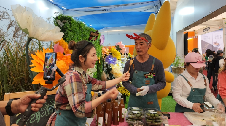 ![]() 제농업박람회 함평홍보관 부스에서 해름 스토어 운영하는 모습과 라이브커머스 방송장면 |