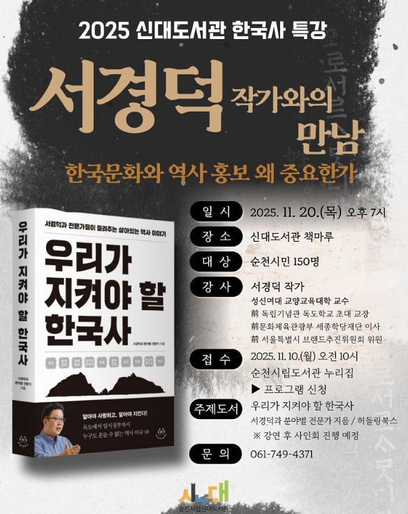 이번 강연은 순천시립도서관 누리집을 통해 사전 신청할 수 있으며, 자세한 사항은 신대도서관으로 문의하면 된다.
