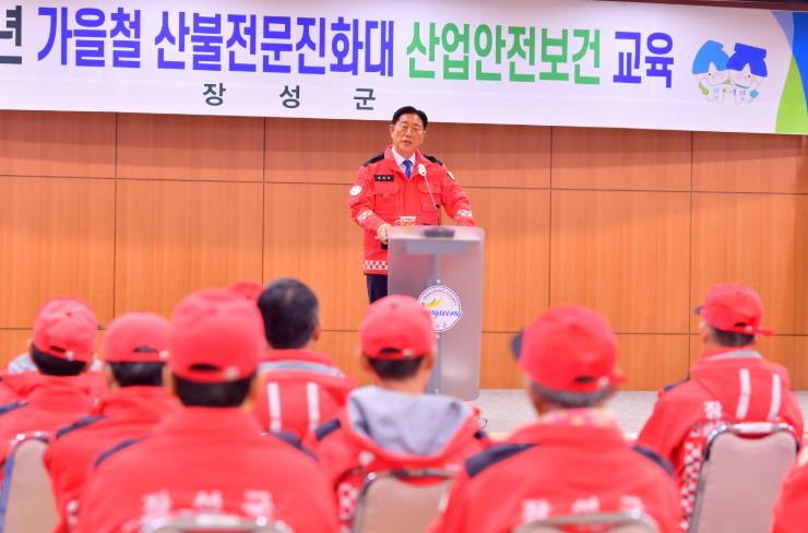 ![]() 김한종 장성군수가 6일 산불전문진화대 교육에 앞서 감사 인사를 전하고 있다. 장성군 제공 |