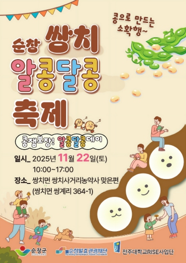 순창군, 순창발효관광재단, 전주대학교 RISE사업단과 공동으로 주최하는 이번 축제는 지역소멸에 대응한 차별화된 마을축제로, 순창 쌍치콩을 활용한 체험 프로그램과 알콩달콩 금혼식, 먹거리 부스 등이 어우러져 관광객과 지역 주민이 함께하는 화합의 장이 될 전망이다.