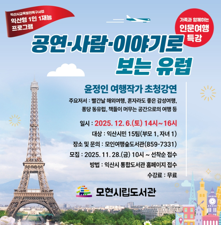 익산시는 여행작가 윤정인 초청 강연 '공간, 사람, 이야기로 보는 유럽-가족과 함께하는 인문여행'을 12월 6일 오후 2시 모인여행숲도서관에서 개최한다.