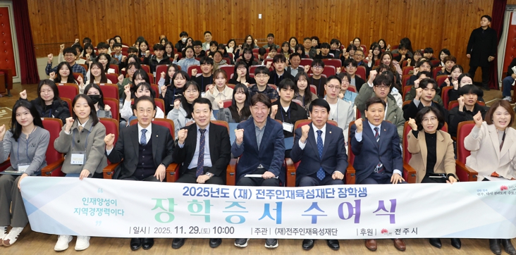 전주인재육성재단은 29일 전주시청 강당에서 ‘2025년도 2학기 (재)전주인재육성재단 장학생 장학증서 수여식’을 개최하고, 장학생으로 선발된 70명의 학생에게 장학증서를 수여했다.