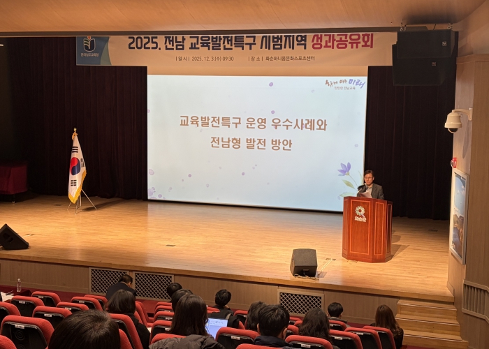 ![]() 12월 3일 화순하니움문화스포츠센터에서 ‘2025. 교육발전특구 시범지역 교육청-지자체 합동 성과공유회’가 열리고 있다. |