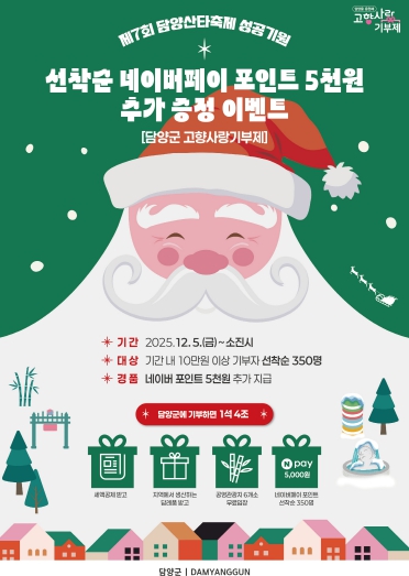 군 관계자는 “제7회 담양산타축제의 성공을 기원하고 연말 고향사랑기부금 모금 활성화를 위해 이번 이벤트를 마련했다”며 “담양을 사랑하는 많은 분들의 관심과 참여를 부탁드린다”고 말했다.