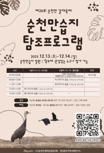 특히 겨울의 순천만에는 현재 흑두루미 약 8,600마리를 비롯해 멸종위기종인 독수리, 노랑부리저어새 등 희귀 철새가 대거 도래하고 있어, 이번 축제는 국내 최대 규모의 겨울철새 서식지를 현장에서 체험할 수 있는 특별한 기회가 될 전망이다.
