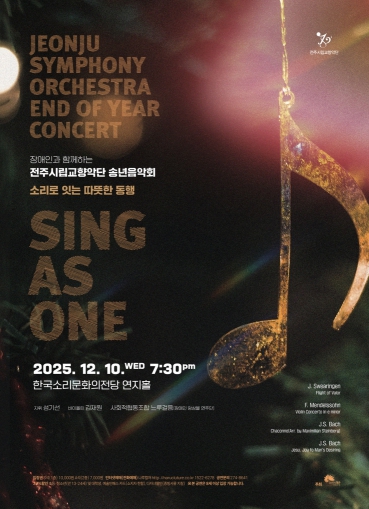 노은영 전주시 문화체육관광국장은 “이번 공연은 연말 감성을 담은 음악 속에서 사회적 포용의 가치를 공유하는 뜻깊은 무대가 될 것”이라며 “시민들이 함께 참여해 예술이 전하는 따뜻한 메시지를 나누길 바란다”고 말했다.