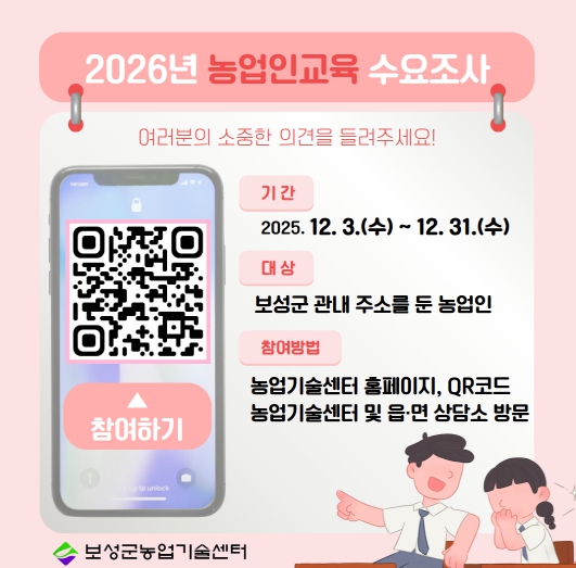 ![]() 보성군, 2026년 농업인 교육 수요 조사 실시_2026년 농업인교육 수요조사 홍보용 이미지 |