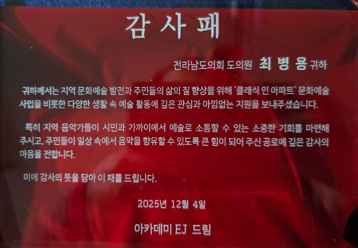 ![]() 최병용 전남도의원, ‘생활 속 문화예술’ 확산 공로 감사패 수상 |