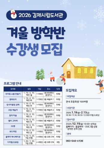 ![]() 김제시립도서관, 2026년 겨울 방학 프로그램 운영 |
