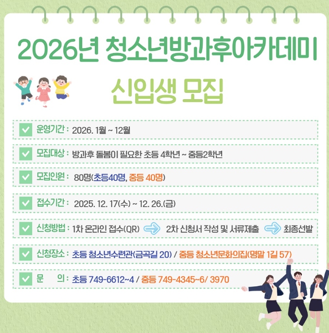 ![]() 순천시, 2026 청소년방과후아카데미 신입생 모집 |