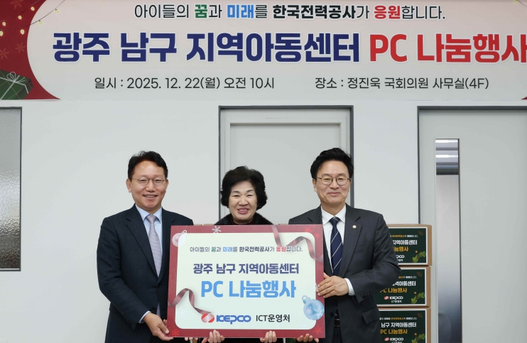 ![]() PC나눔행사_왼쪽부터 한전 문일주 기술혁신본부장, 남구지역아동센터연합회 형기해 회장, 정진욱 국회의원 |