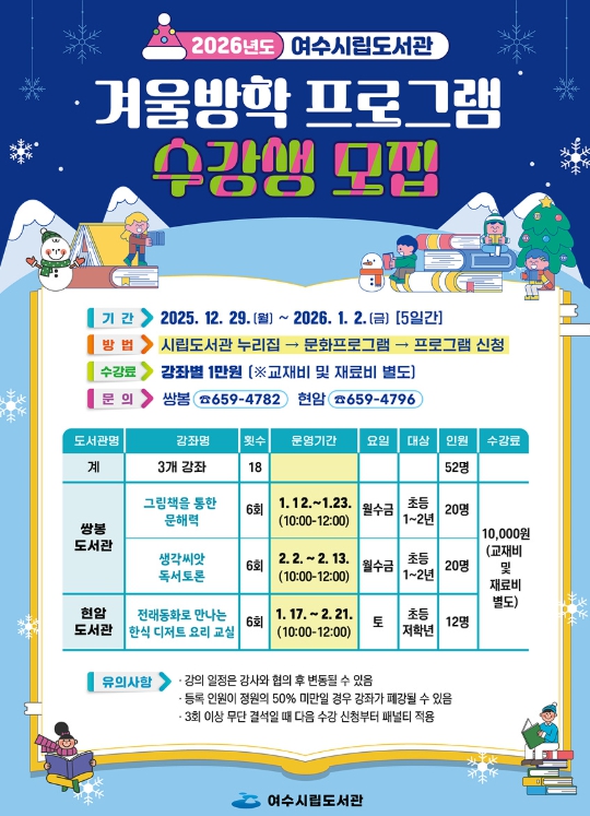 ![]() 여수시립도서관 겨울방학 프로그램 수강생 모집 홍보물 |