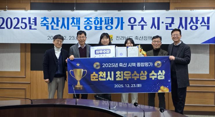 ![]() 시 관계자들이 순천시의 2025년 전라남도 축산시책 종합평가 최우수상 수상을 기념해 기념촬영을 하고 있다 |
