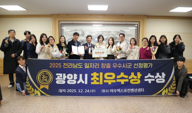 ![]() 광양시, ‘전라남도 일자리 창출 우수 시군 평가’ 최우수상 수상 |