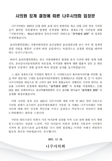 ![]() 나주시의회, 시의원 징계에 따른 입장문 발표 |