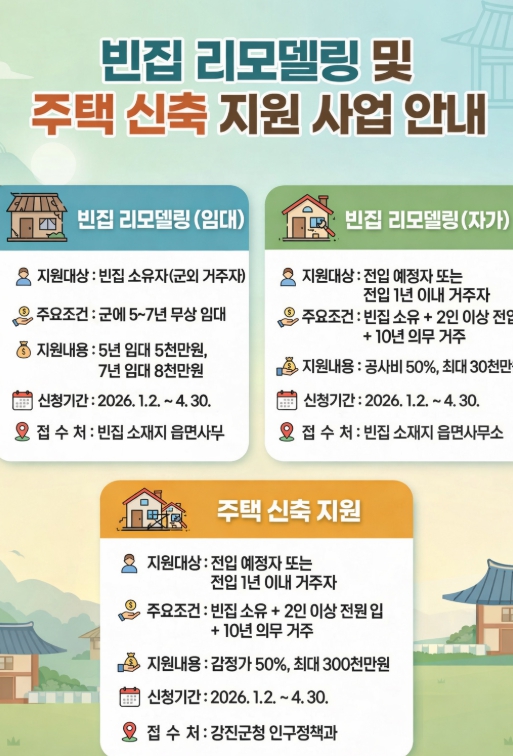 군은 ‘2026년 주택 신축 지원사업’과 ‘상반기 빈집 리모델링 지원사업’을 통해 전입 예정자와 신규 전입자의 주거 안정과 정주 기반 마련을 지원할 계획이다.