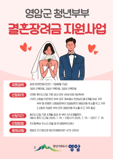 ![]() 영암군 청년부부 결혼장려금 지원사업 포스터 |