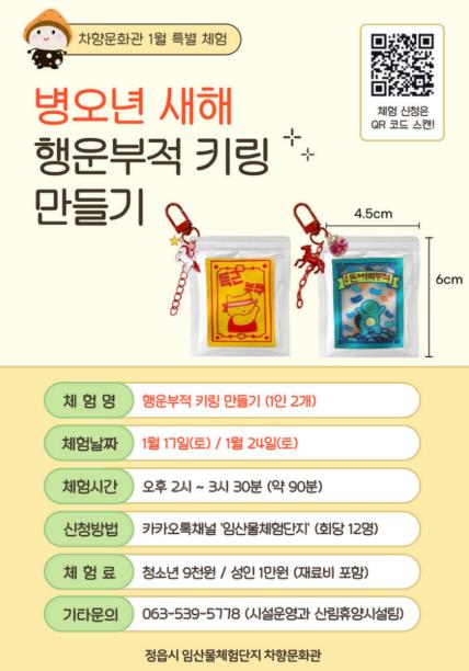 ![]() 정읍 차향문화관, 새해 소망 담은 ‘행운 키링’ 만들기 운영 |