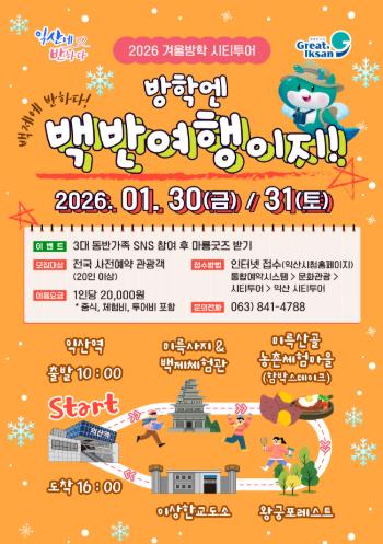 시 관계자는 "이번 시티투어는 겨울방학을 맞아 관광객들이 익산에서 특별한 추억을 만들 수 있도록 기획했다"며 "앞으로도 다양한 주제의 시티투어를 통해 관광객을 유치하고, 지역 경제에 활력을 더하겠다"고 밝혔다.