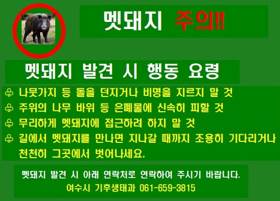 여수시는 멧돼지 피해 예방을 위해 유해야생동물 피해방지단을 선발 및 운영하고 있으며 출몰 우려 지역을 중심으로 피해방지단의 순찰을 강화하고 있다.