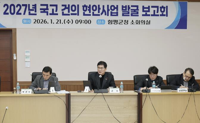 2027년도 신규 국고 건의 사업으로는 ▲함평 빛그린 미래 모빌리티 상생 혁신거점 구축(200억) ▲함평 공설운동장 리모델링 사업(140억) ▲평능천 자연재해위험개선지구 정비사업(131억) 등 18건으로 지역 성장 기반 확충과 신산업 육성 및 재난·재해 예방에 초점을 맞췄다.