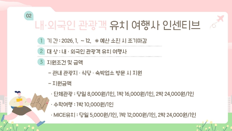 MICE 행사는 당일 5천 원, 1박 1만2천 원, 2박 2만4천 원이 지급된다. 관내 여행사가 관광객을 유치한 경우에는 1인당 5천 원이 추가 지원되며, 외국인 관광객 유치 시에는 1인당 3천 원이 추가로 지원된다.