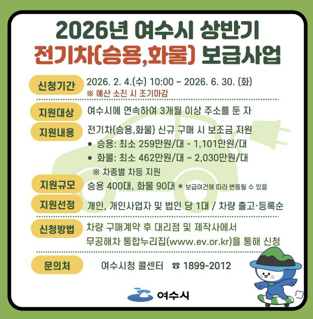 ![]() 여수시가 2026년 상반기 전기자동차 구매보조금 지원사업을 추진한다. |