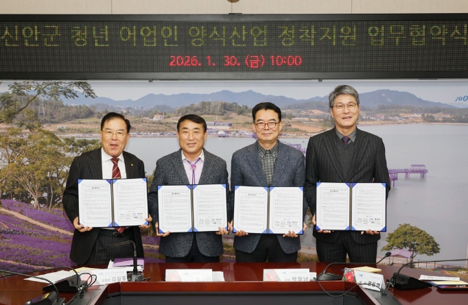 ![]() 30일, 신안군 청년 어업인 양식산업 정착지원 업무협약을 체결했다. (왼쪽부터) 김길동 신안군수협장, 김대인 신안군수 권한대행, 박철남 신안해양과학고등학교장, 권동혁 ㈜신안천사김 대표 |