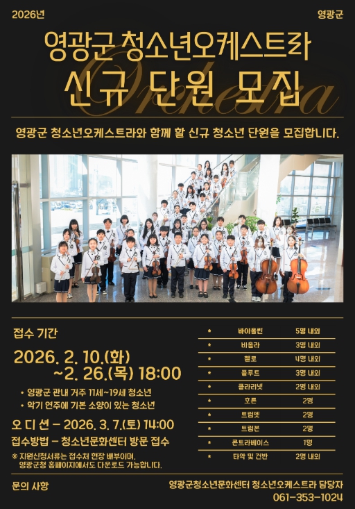 영광군 관계자는 “청소년오케스트라는 단순한 음악 활동을 넘어, 청소년들이 함께 배우고 성장하는 소중한 문화 공간”이라며 “음악을 사랑하는 청소년들의 많은 관심과 참여를 바란다”고 전했다.