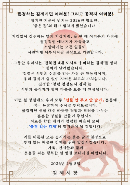 이번 청렴 주의보는 부패 취약 시기인 설 명절을 전후로 5일부터 오는 18일까지 발령되며, 공직사회 전반에 깨끗하고 투명한 청렴 의식을 고취하고 시민과 함께하는 투명하고 깨끗한 김제를 구현하기 위해 추진된다.