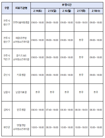 권역응급의료센터 등 주요 응급의료기관의 과부하를 줄이고 경증 환자의 외래 진료 공백을 최소화하기 위해, 연휴 기간 하루 평균 의료기관 459개소와 약국 240개소가 운영된다. 특히 소아 응급환자 진료 공백을 최소화하기 위해 예수병원 소아전문응급의료센터는 24시간 운영되며, 달빛어린이병원과 원광대학교병원 권역응급의료센터 소아진료실도 정상 운영된다.